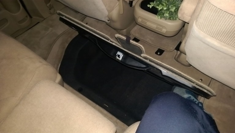 Recall from the video at the top of this post that the space vacated by those third row seats is now occupied by a wooden frame with a panel over it, allowing us to store stuff and keep a flat surface area for the bed. Three guesses as to who built that frame for us.
