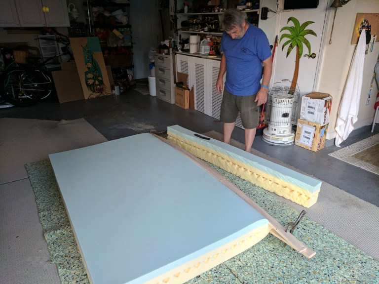 When we say “we” cut the mattress, we are of course referring to Mitch’s dad. Not that we hadn’t planned to help — just that he prefers to start his day at 5am which means he’s starting without us. In a way, it was more like Christmas than teamwork… you awaken to find a sliced up mattress waiting for you, thanks to a guy with a beard.