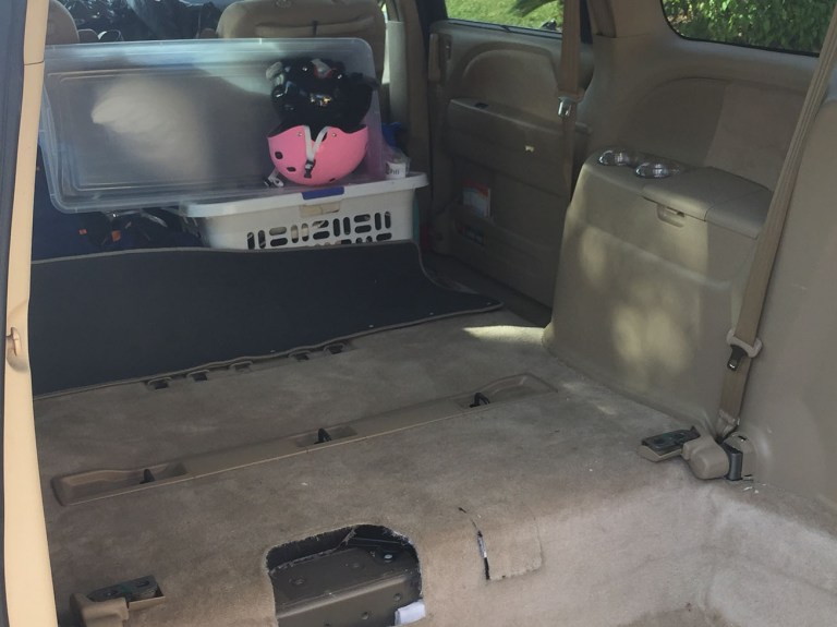 Now, behind Hailey in that pic is the third row, which folds flat for convenience. Well, that wasn’t convenient enough — since we’re putting a bed in here, the seats will be useless, which means they’re dead weight and more importantly taking up a ton of available space. Trouble is, these seats aren’t designed to come out.