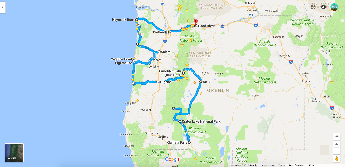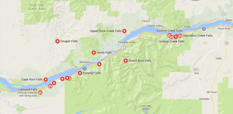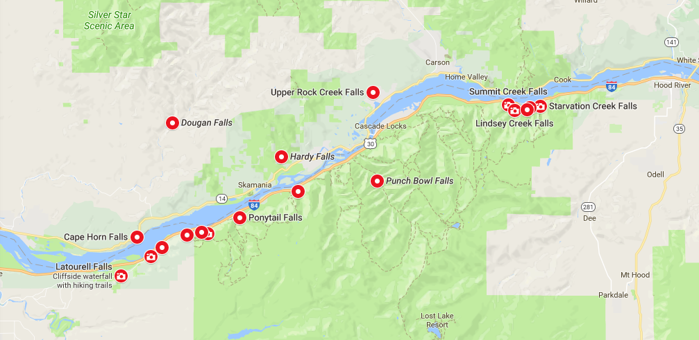 Historic Columbia Highway 30 is the route to take, winding you up to Crowne Plaza at the top of the gorge before dropping you down into waterfall country. No joke, this is the place to be in the continental U.S. if you love waterfalls. The map below is even missing a few we’re aware of: