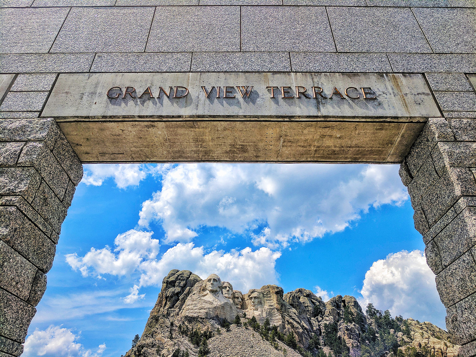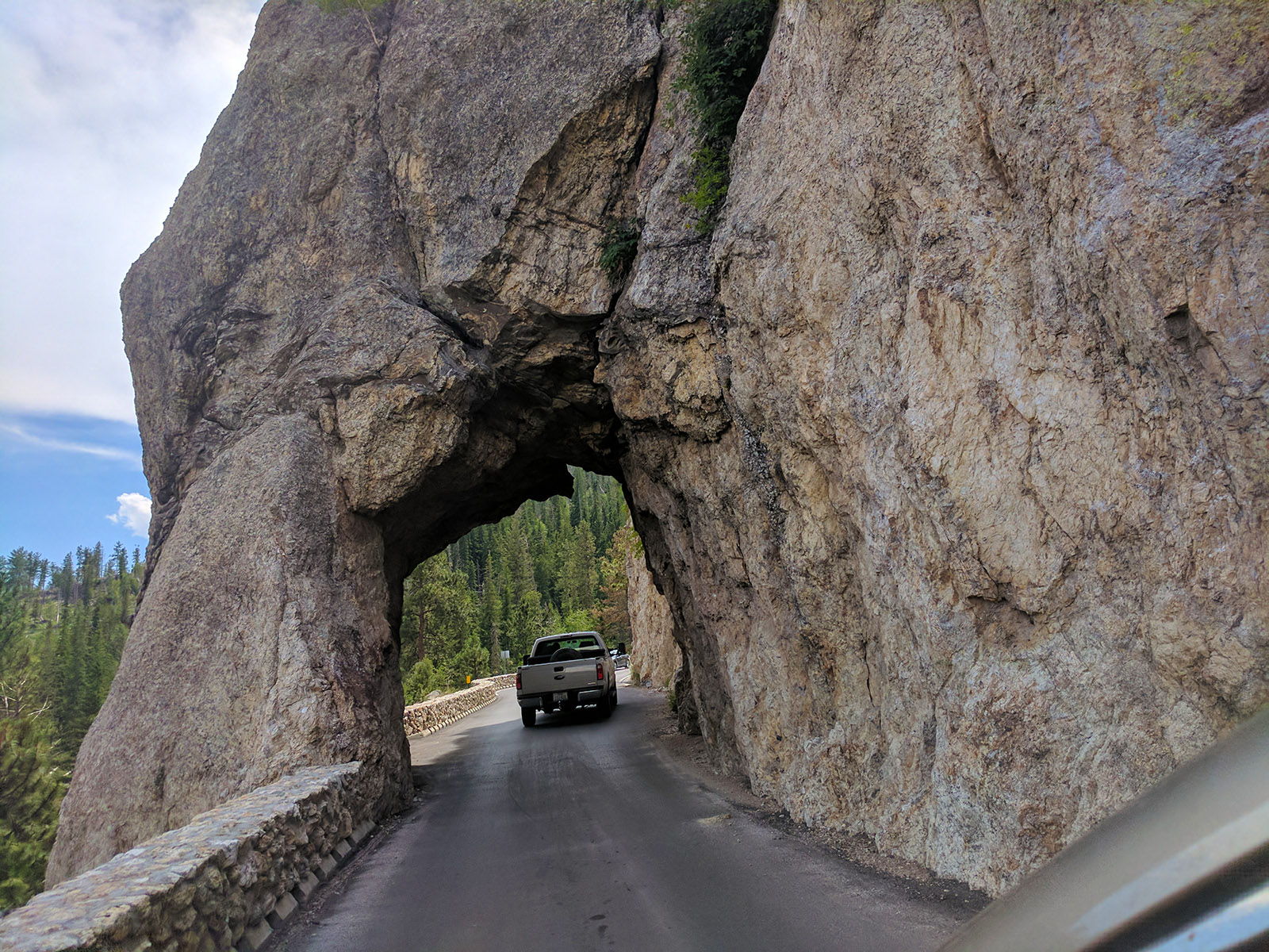 If you prefer not to get scalped on the $20 parking fee, you may find the view below more wholesome, if also more distant: the four prezzies coming into view as you pass through this tunnel in Black Hills National Forest.