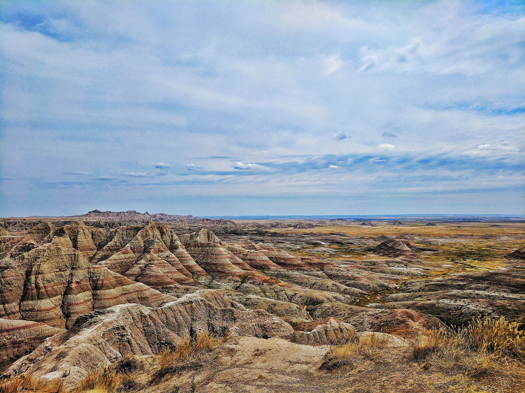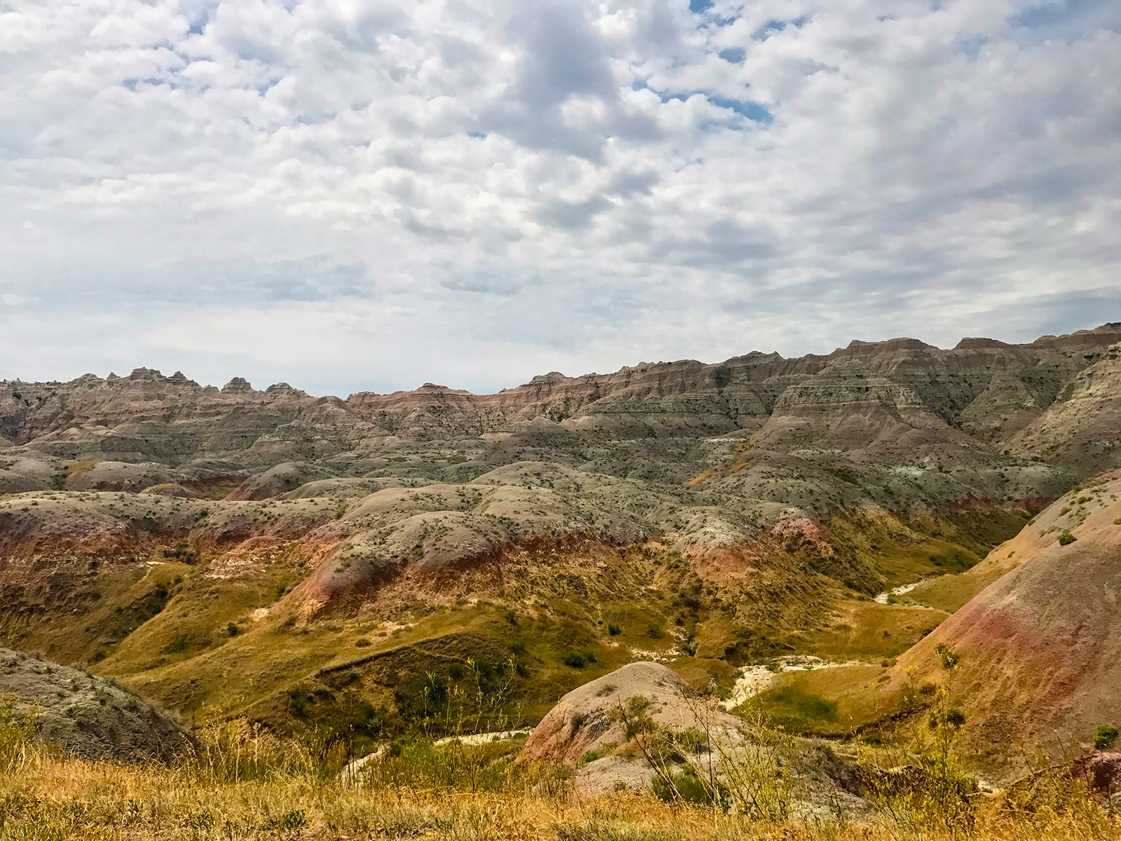 Badlands National Park! Keeper of some of the world’s richest fossil beds, and subject of many a poetic quote from such famous grizzled old timers as — you guessed it — Theodore Roosevelt. We, on the other hand, register much lower on the Grizzle-O-Meter, and at this point also quite sweltering from the lack of A/C, so this is all the scenery you get from the Badlands. The theme stays pretty consistent, to be fair.