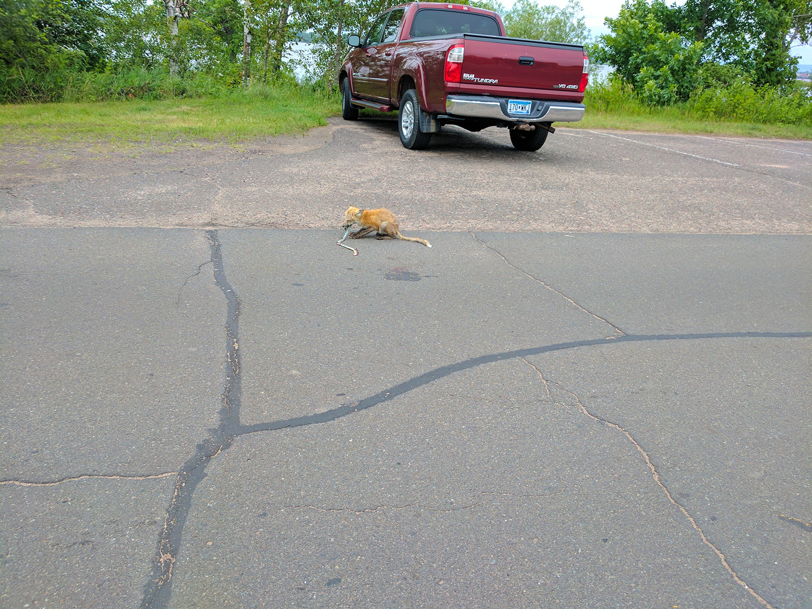 A not-so-healthy fox trying to get away with a not-so-alive snake: