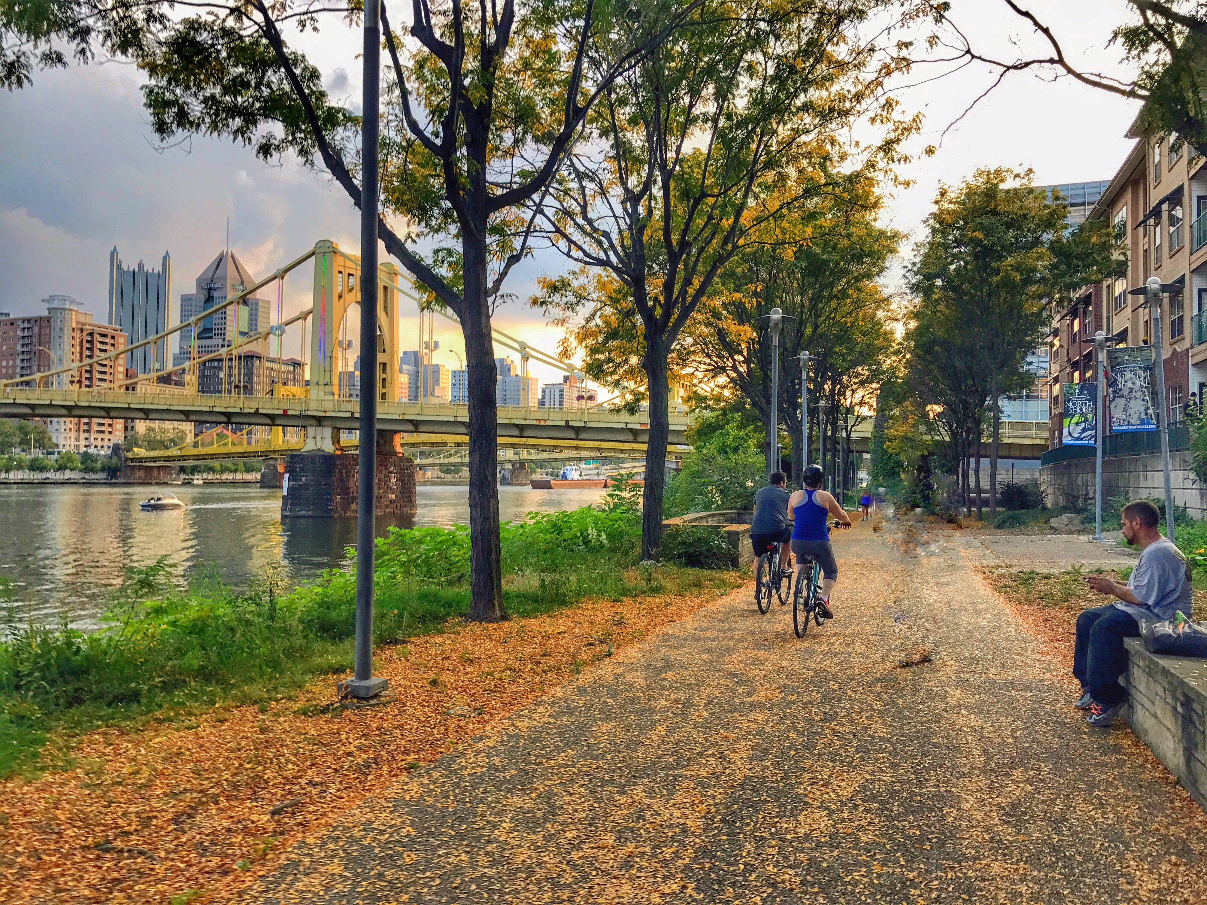 Mitch made short work of getting a new bike to replace the one lost in his summer Cleveland fiasco, and within a few hours, a crew of us were biking down to the North Shore via Millvale Riverfront Park. The leaves of the Northeast are really starting to strut their stuff: