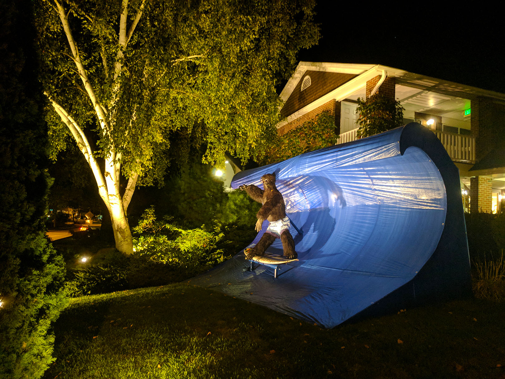 At this point in the trip, we’re getting dangerously close to Halloween — and Ogunquit celebrates with the best of ’em. Here’s a rather unusual lawn ornament consisting of King Kong surfing a wave in his undies.
