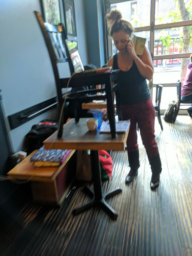 As you may know, Boston is home to many a reputable place of higher learning. The neighborhood of Cambridge, specifically, boasts your Harvards and MITs and what not. It’s not enough that these kids are all packed into coffee shops rather than their own dorm rooms (like, can we have your dorm if you’re not going to use it? Jerks?) But the young woman below took it a step further, turning the Starbucks into her own personal office complete with makeshift “standing desk.”
